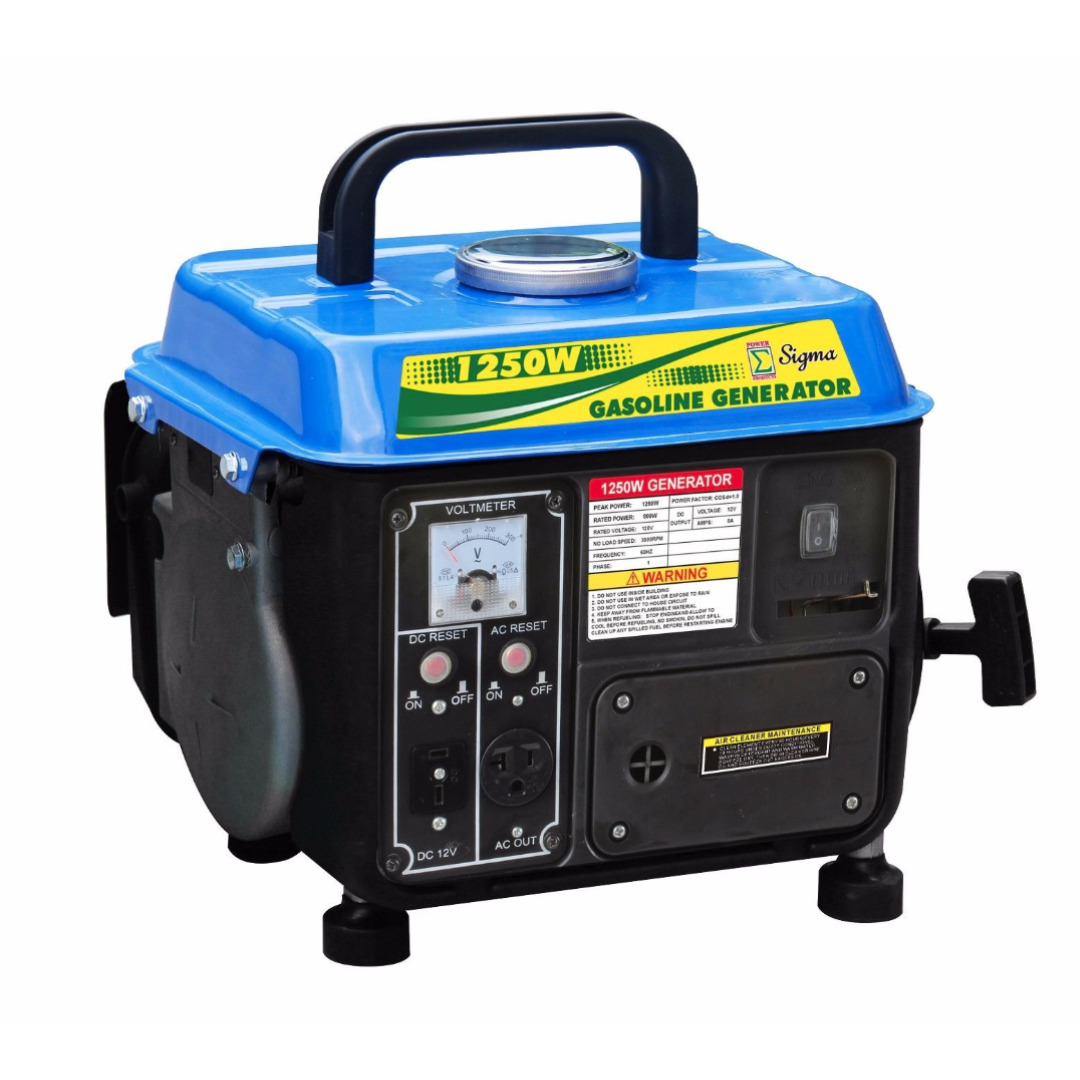 Generador eléctrico Sigma SG1250 de 1250W, 2 tiempos, con arranque de retroceso y bajo nivel de ruido. Ideal para respaldo de energía en exteriores o emergencias.